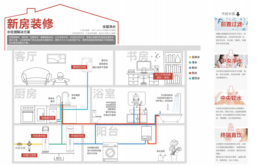 全屋净水对整个房屋的用水进行了分类,一路以洗涤用水为主,另一类以饮用水为主,根据水的用途不同,需要的水处理产品大致为前置产品、中央净水器、软水机、末端直饮水产品。