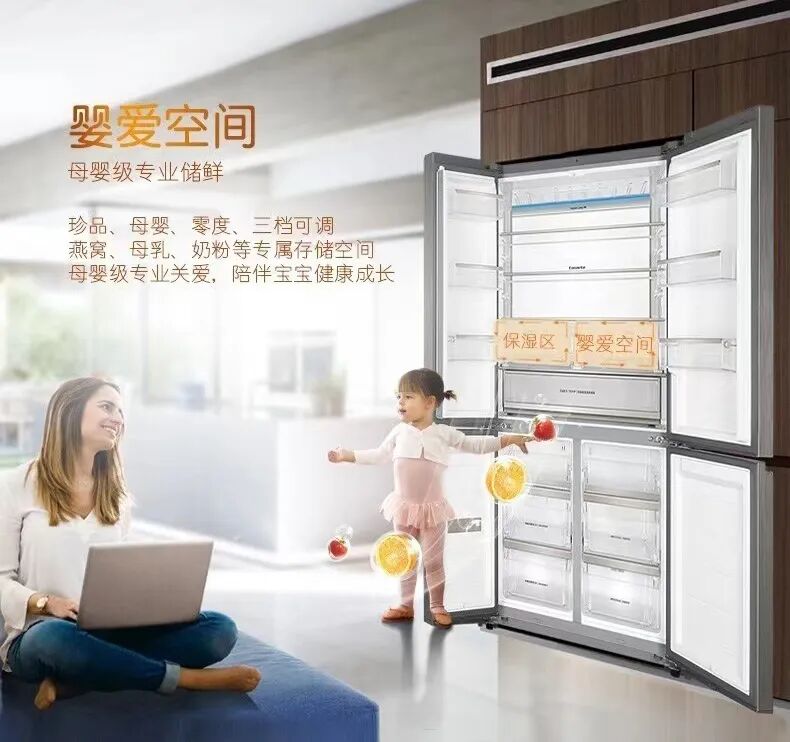 其实多开门冰箱也是一个很好的选择,大多数的多开门冰箱其实是普通双门冰箱、三门冰箱的升级,它还分为十字对开门冰箱和抽屉式多开门冰箱。它们的相同之处是依旧是上层冷藏,下层冷冻的设计,适应多数人的使用习惯。