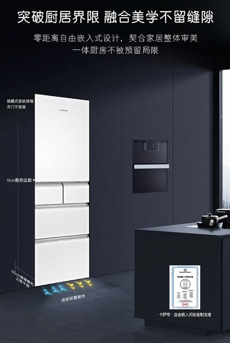 不过它的抽屉设计也让它的制冷系统变为精控双系统,冷藏室和冷冻室独立制冷。这里要说一下卡萨帝BCD-633WLCFDMFVAU1的特别之处,它与之前说的几款冰箱的不同之处还在于它的散热方式,它可以做到侧边2cm散热边距,并且冰箱厚度61cm,可以90°直角开门,拥有5cm超薄门体,这都说明这款冰箱非常适合以嵌入式冰箱的形式放置于厨房橱柜之间。