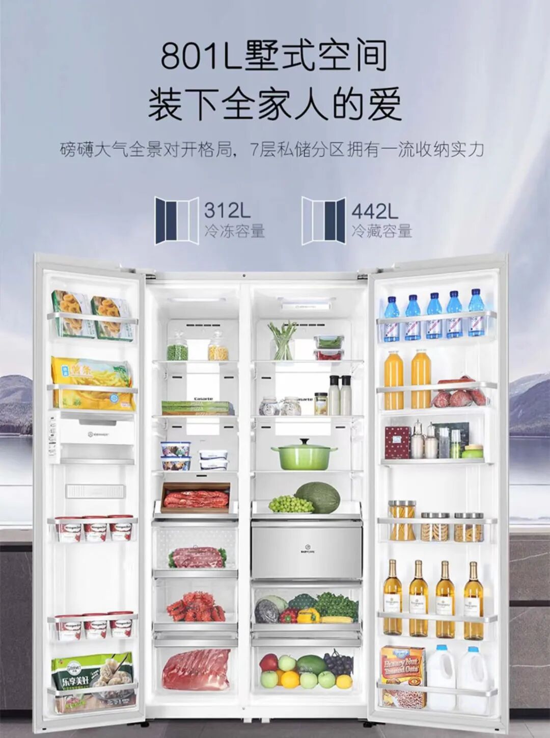 442L冷藏容量+312L冷冻容量,可以满足疫情封控以后一周左右储备蔬菜肉蛋奶的量。