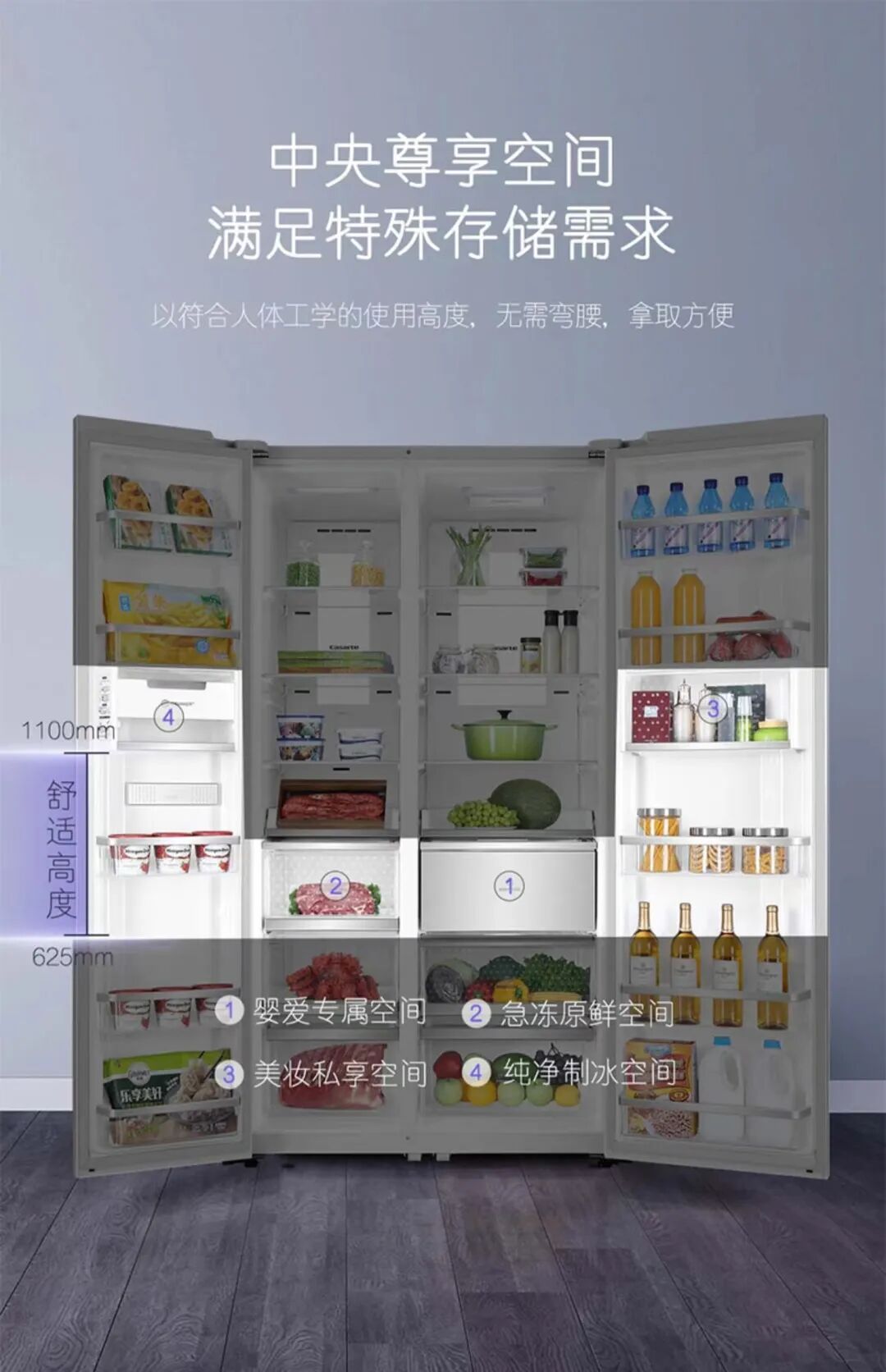 从容量分区可以看出,十字对开门还是比较注重冷藏空间的容量,其冷藏室的容量甚至比卡萨帝WD-801BCPU1对开门冰箱的冷藏室还要大。依然有婴爱空间和鲜活保湿区,分区收纳没有对开门冰箱设计得那么细致,却提升了它的日常实用性。