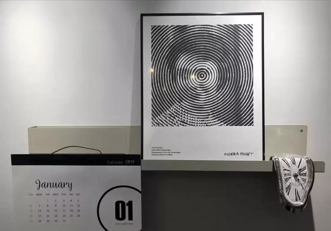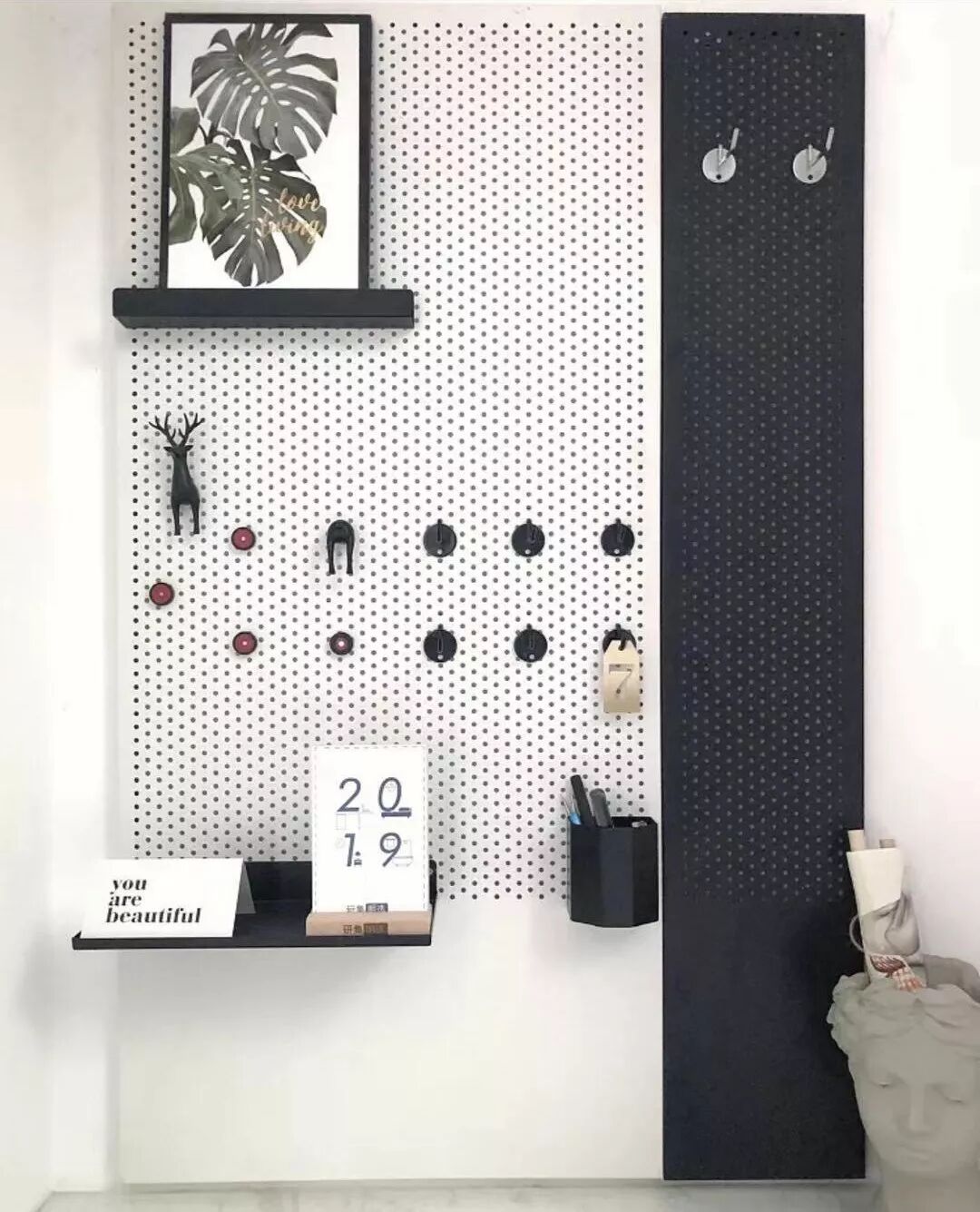 主卧之写字桌篇:原创设计,大理石灰色纹路台面,买的黑白两块铁艺洞洞板,拼接而成,安装是个头疼的事情,我们家很多承重墙,打孔真的很费力。最近收到来自上海研集明选2019款精美台历,很赞!