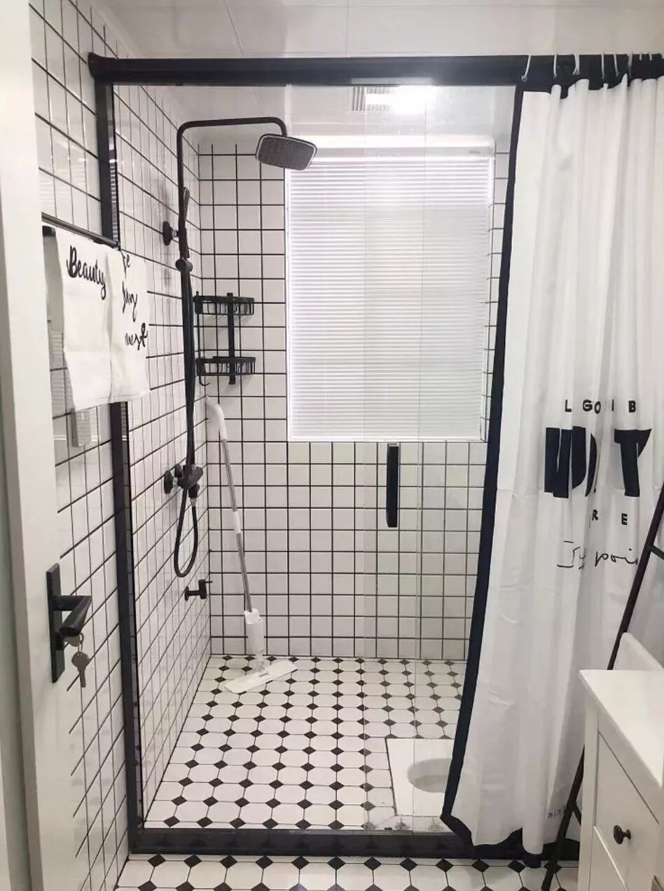 卫生间之黑白风:2.0版本毕业照[家里装修中首个毕业的区域]除了朗斯玻璃门和瓷砖,其他所有购于某宝!