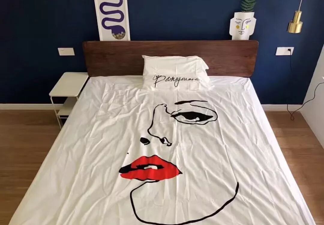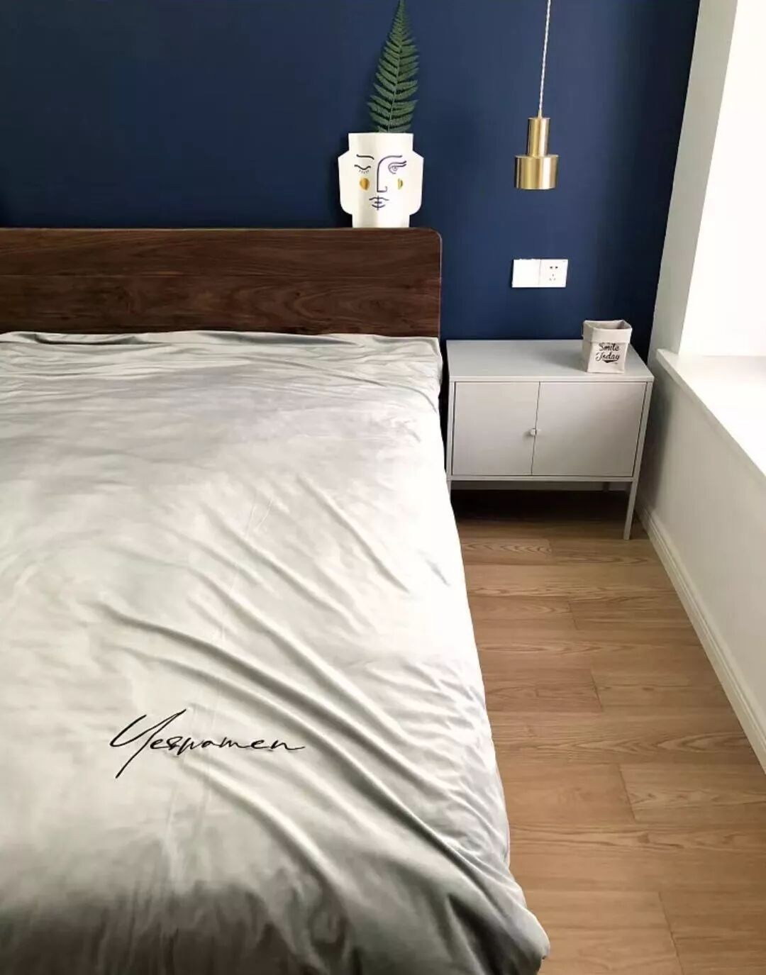 主卧:深邃蓝配的北美黑桃木实木床,宜家LadyGaga合作限量款,乌米德巴被套刚出的时候一眼看中,找上海代购下的单,结果用的时候发现是1.5米宽的,尴尬!