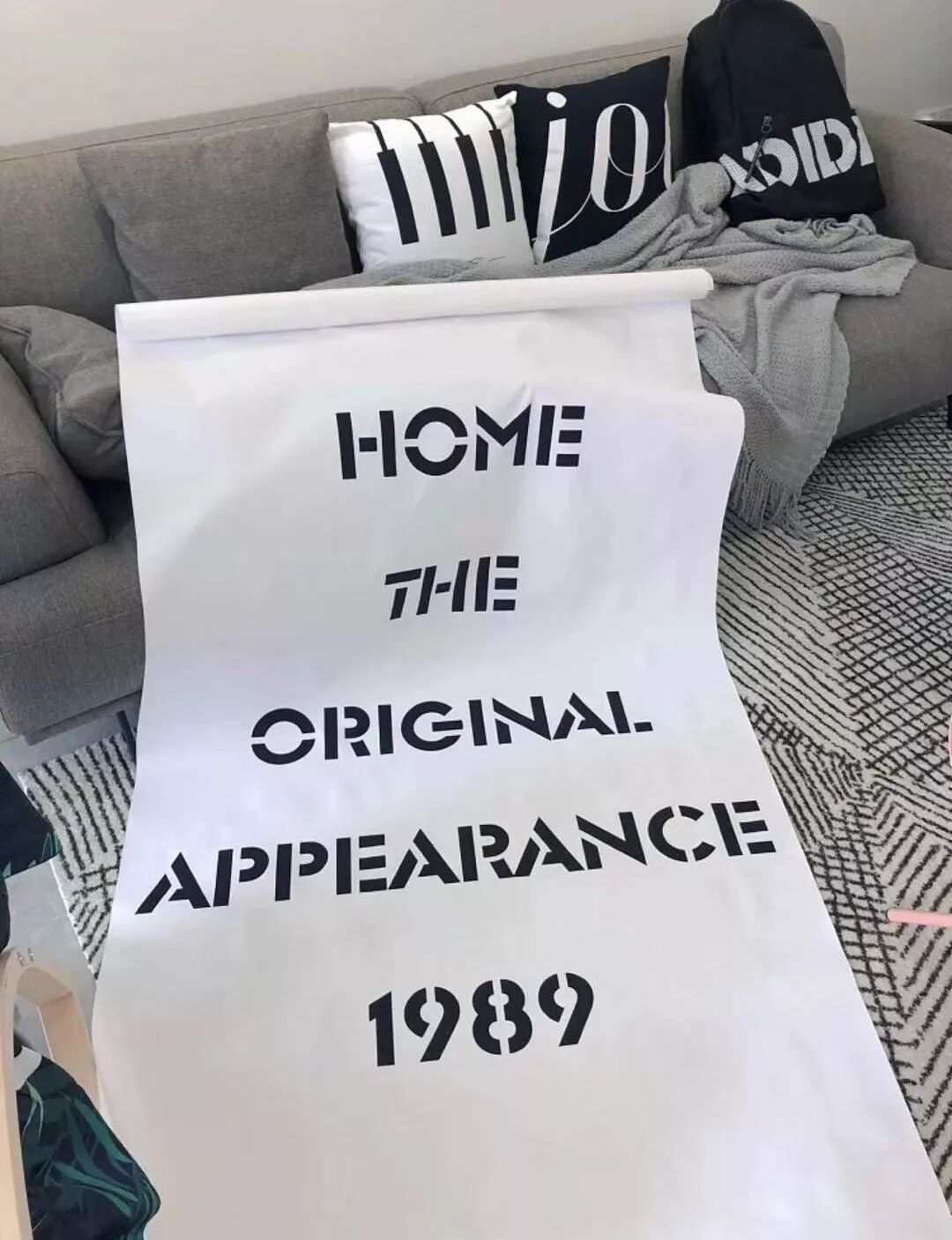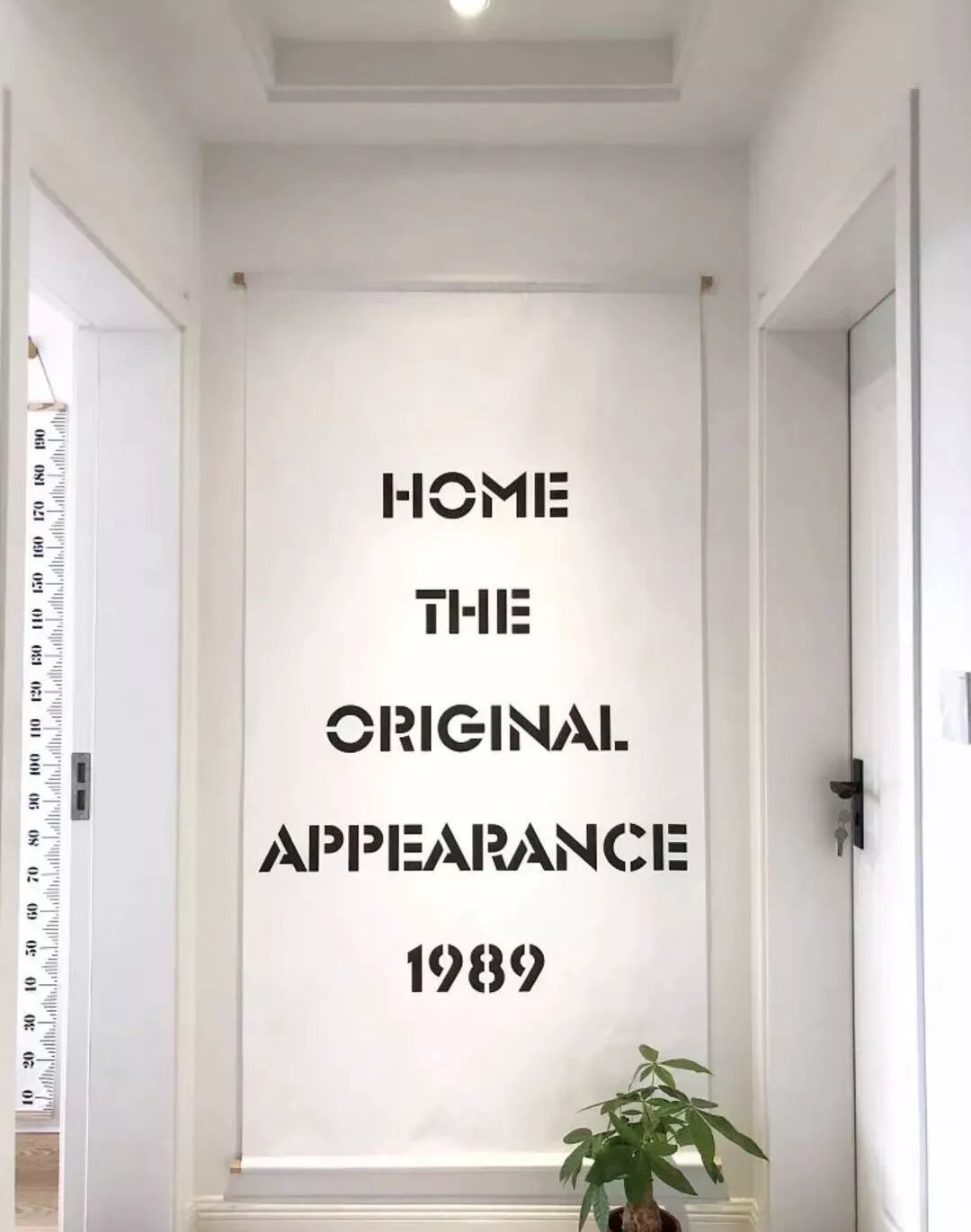 翻译:家,最初的样子,1989是对我们这个年份的一种缅怀。 制作过程:找到自己喜欢的笔刷,设计好黑体大英文居中排版,然后找某宝制作的防水油画布,我家尺寸是长200cm宽105cm,方形木条是110cm,因为方形的好固定在墙面,收到画后找当地的裁缝两边做一个封口,方形木条穿进去,打孔上墙,后期可以任意换画芯,几十块钱就搞定,性价比是不是爆炸?哈哈!