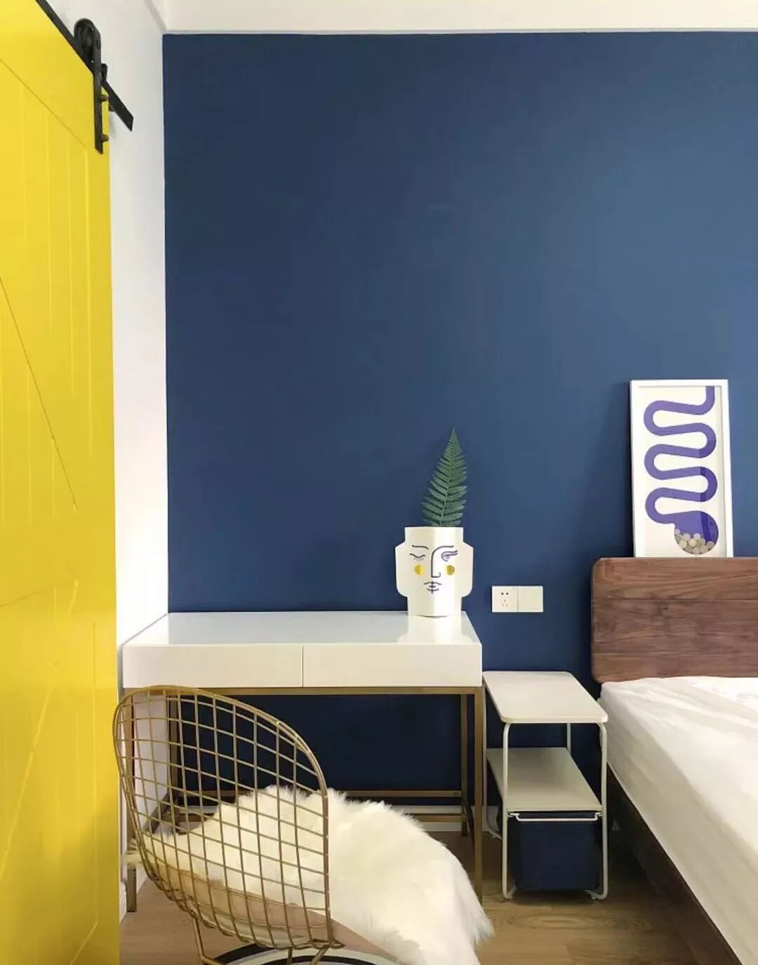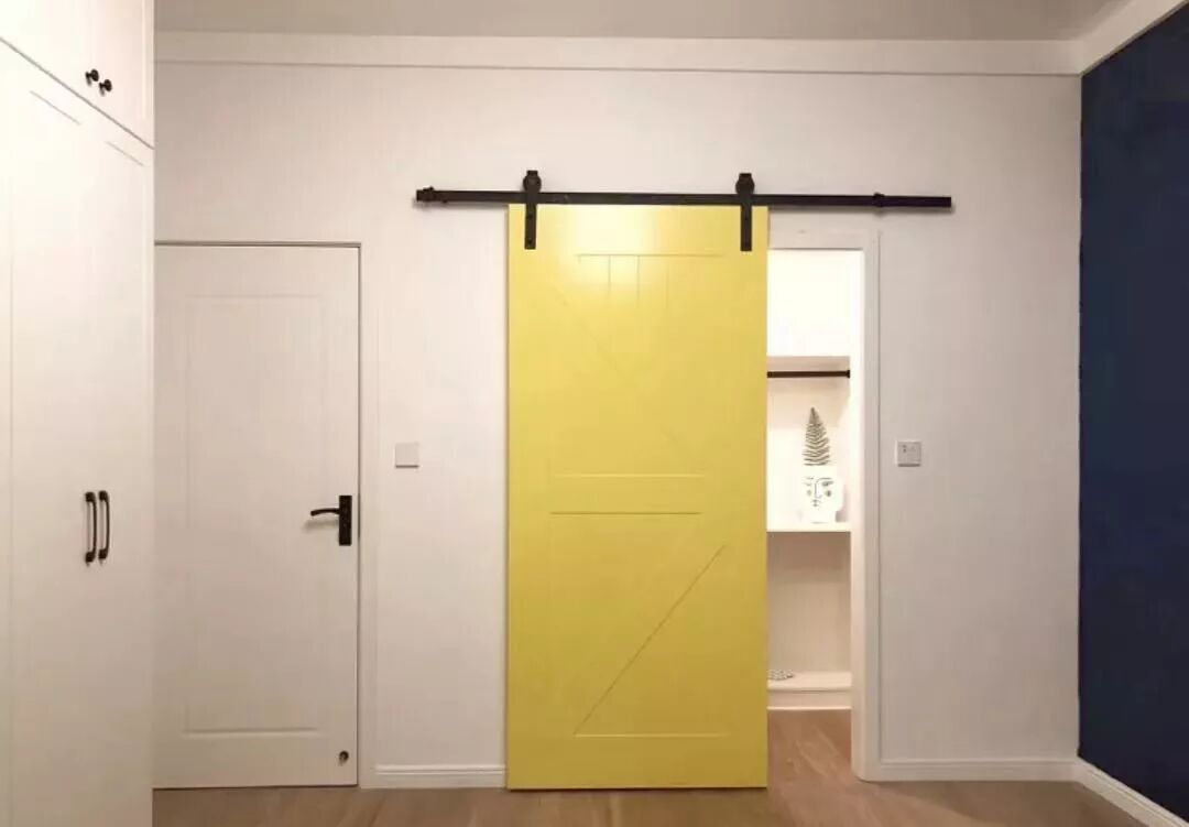 主卧之衣帽间篇:这个谷仓门木工进场的时候就在某宝定制的尺寸,想好主卧用深邃蓝做床头背景墙面,所以特意选了黄色风格,匹配度非常抢眼。