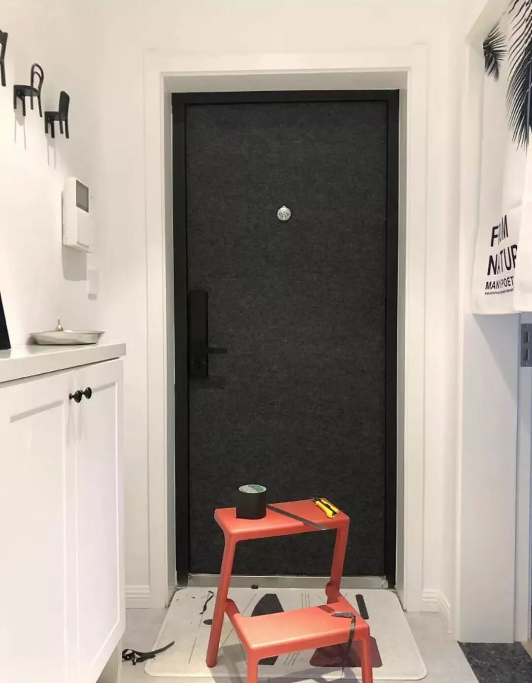 大门改造篇:自己动手DIY,先用毛毯自带的背胶关门满铺防盗门,然后门框用黑色美纹纸收边,拯救猪肝红大门,完工!