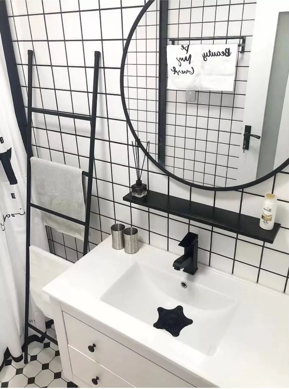 卫生间之浴室柜:铁艺梯子毛巾架,这款浴室柜淘了很久。还未入住!