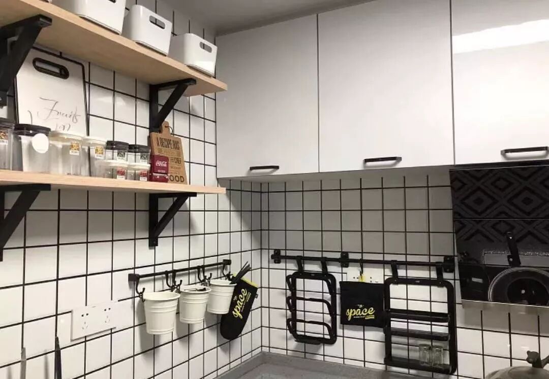厨房之置物架篇:马戏团团购的伊沐馨黑色太空铝免钉款,木隔板自己测量好尺寸在某宝定的红橡木木板,配的宜家托脚。自己设计的橱柜布局,跟泥工和木工对接后施工,橱柜投资成本超级低,只花了定制橱柜一半的价格,高性价比!