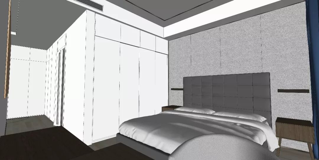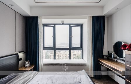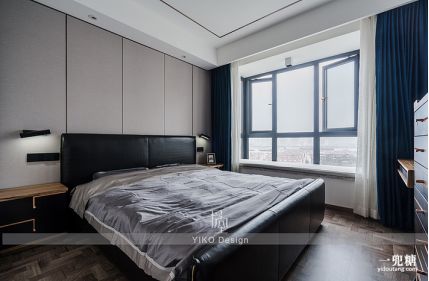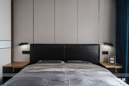 考虑到朱先生和龙小姐的职业特性和性格特点,主卧风格采用优雅大方、现代轻奢的设计风格,而在灰色装饰硬包床背景上,点缀钴蓝色窗帘是轻奢风格的不可缺少的一抹元素。