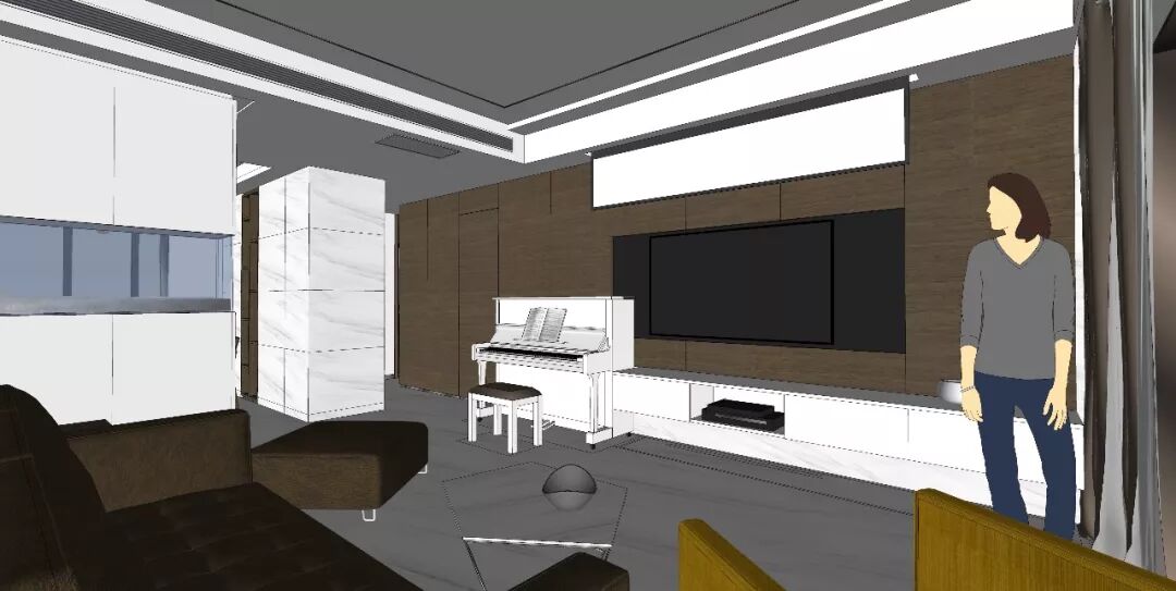 在客厅,因考虑到父母将要培养小孩子艺术特长,藻藻小朋友需要在家勤练钢琴,因此该如何在有限空间摆放体积庞大的钢琴呢?