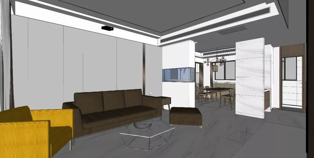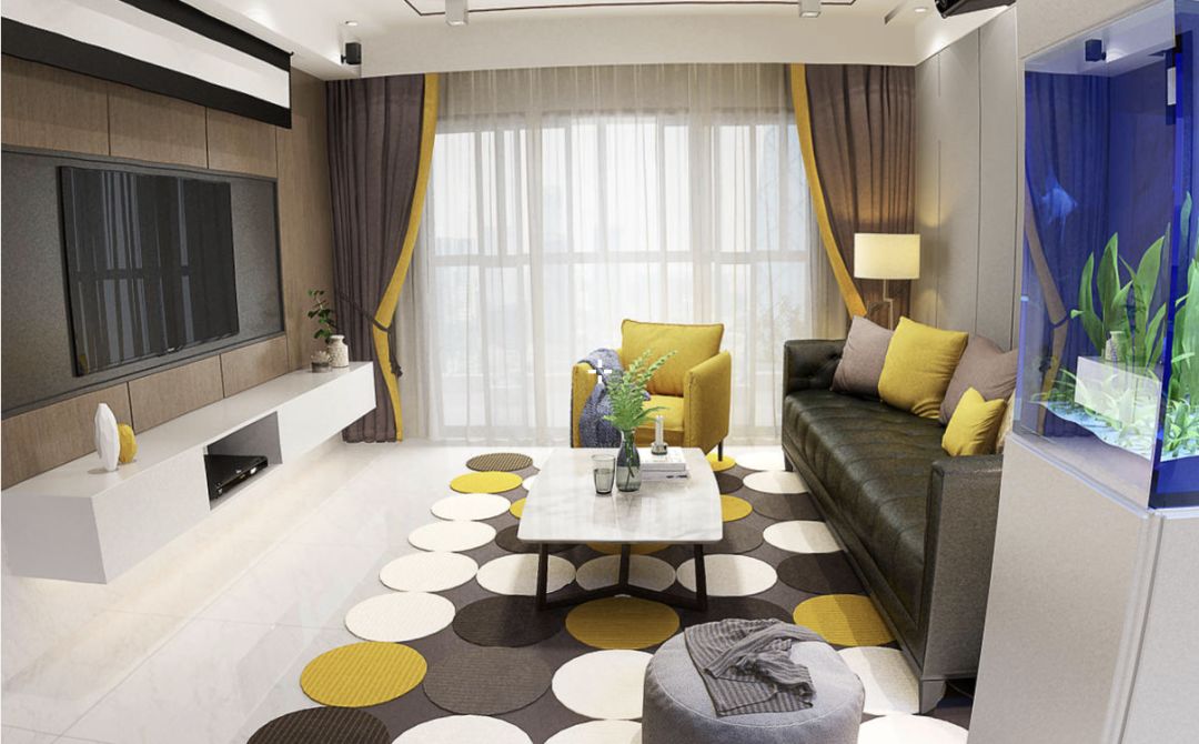 最后放上几张改造完成后客厅餐厅部分的效果图,想象在周末的傍晚,躺在柔软的沙发上,夕阳从阳台闯进房间,橘黄色的阳光透过宝蓝色的鱼缸玻璃,折射出梦幻斑斓的光影。
