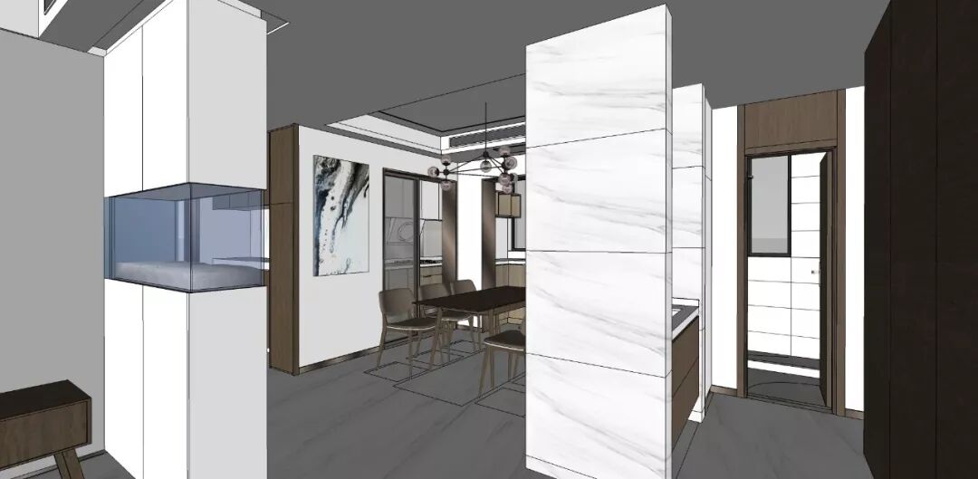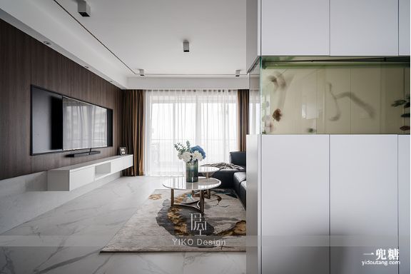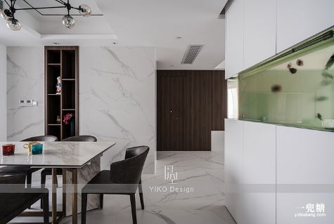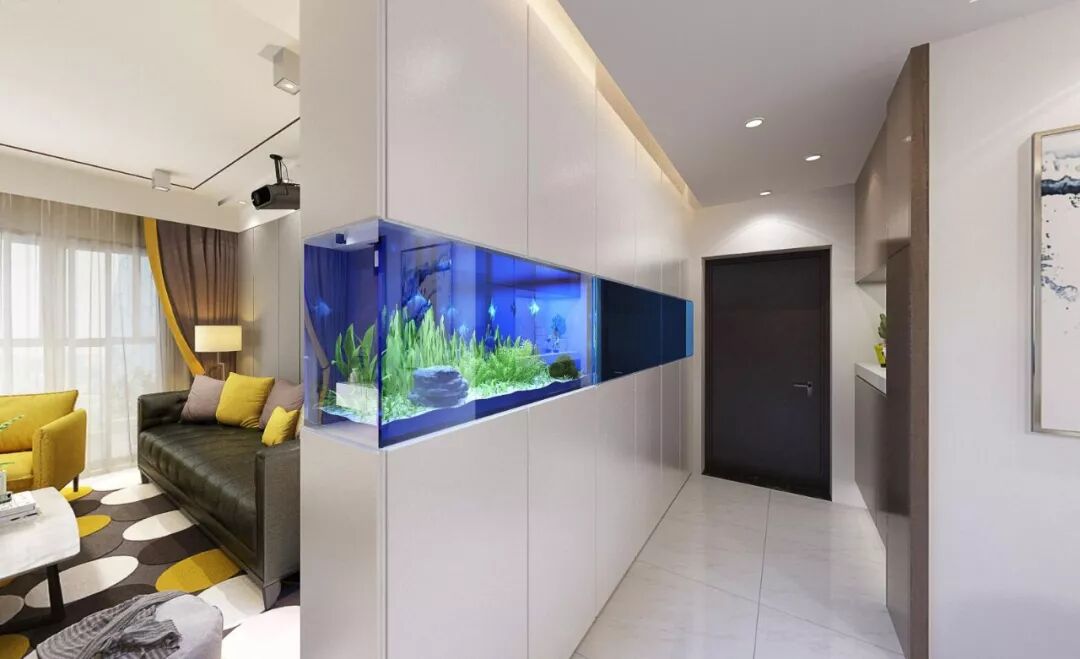客厅餐厅中间的整体嵌入式鱼缸是这次改造的一大设计亮点,因为房主朱先生喜好养鱼,要求预留鱼缸的位置,但如果单独空出一块地方放置鱼缸的话,空间就会受限,伊空巧妙地利用整体嵌入式鱼缸和储物柜相结合的特点,完美地解决这个问题。