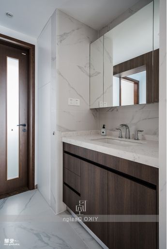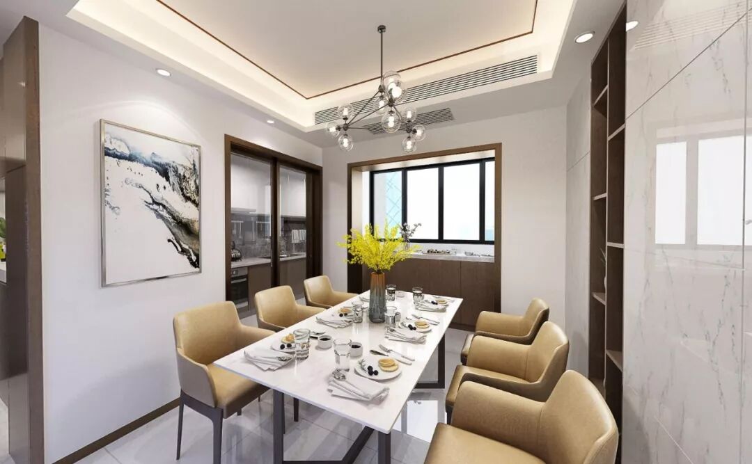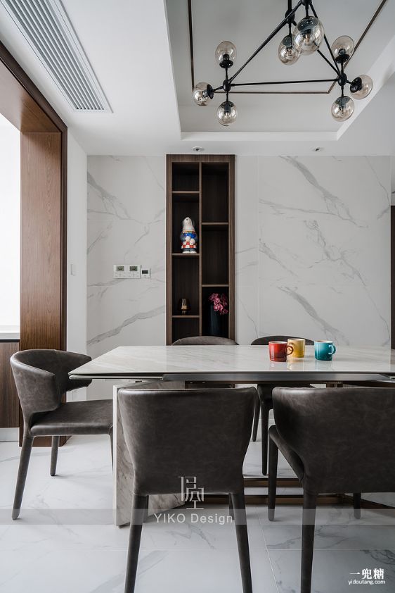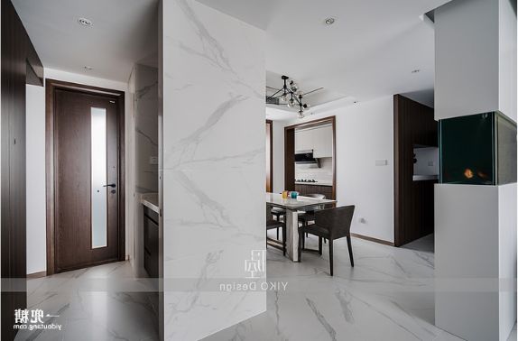 餐厅和公卫墙面的设计沿用了爵士白的地砖逼真的纹理(地砖上墙)使得地面墙面融为一体,营造睿智、理性的极简轻奢的生活质感,干净、有序、清新的气息从一进门就扑面而来,让身为销售精英的房屋主人在家中宴客时,给人一种踏实、稳重的感觉。