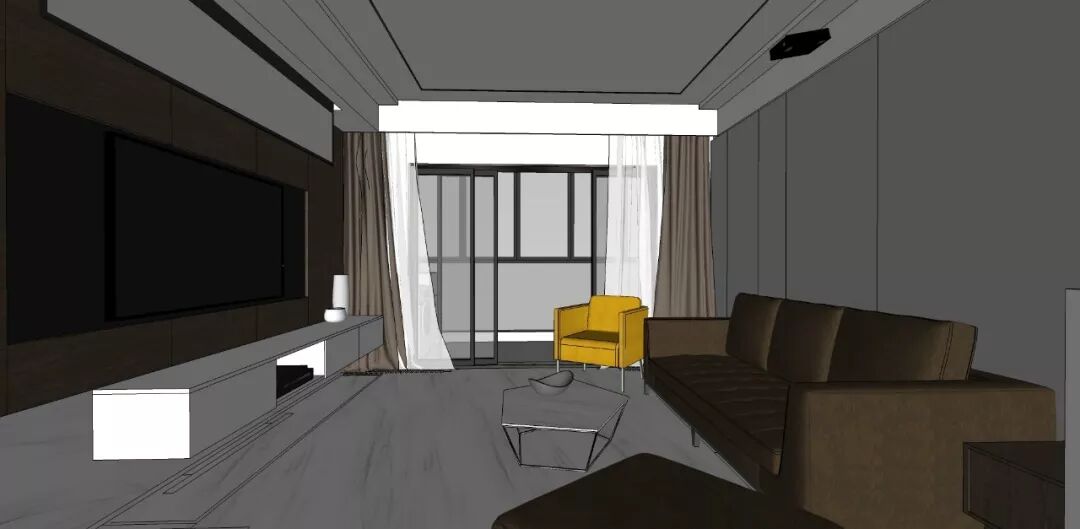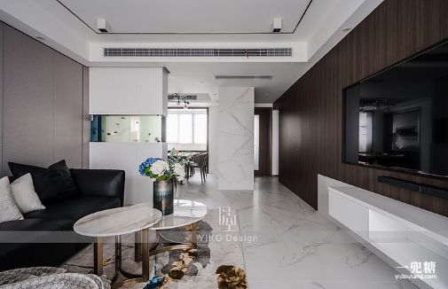 客厅的仿爵士白哑光大砖配上深色黑胡桃木饰面把整体现代轻奢的氛围体现的淋漓尽致。材料、线条深浅的搭配相得益彰,体现业主品位的同时又不会让整体空间觉得沉闷。
