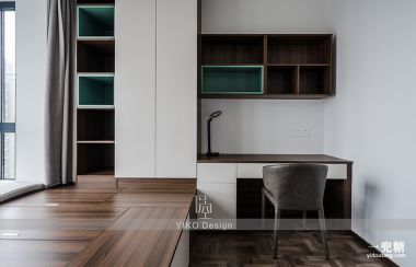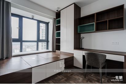 榻榻米设计的风格给房间增加了许多储物空间,而深色的复古拼花地板也可以把房间的轻奢感体现到了极致,让置身空间的人感受到逻辑、有序的力量。