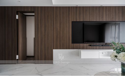 客厅后面就是主卧室,为了缓解主卧房门正对入户门的尴尬处境,主卧门采用与电视背景造型做成一体的木饰面隐形门设计,不细心观察的话还真看不出是一扇门,是不是感觉还有一点点神秘感呢?